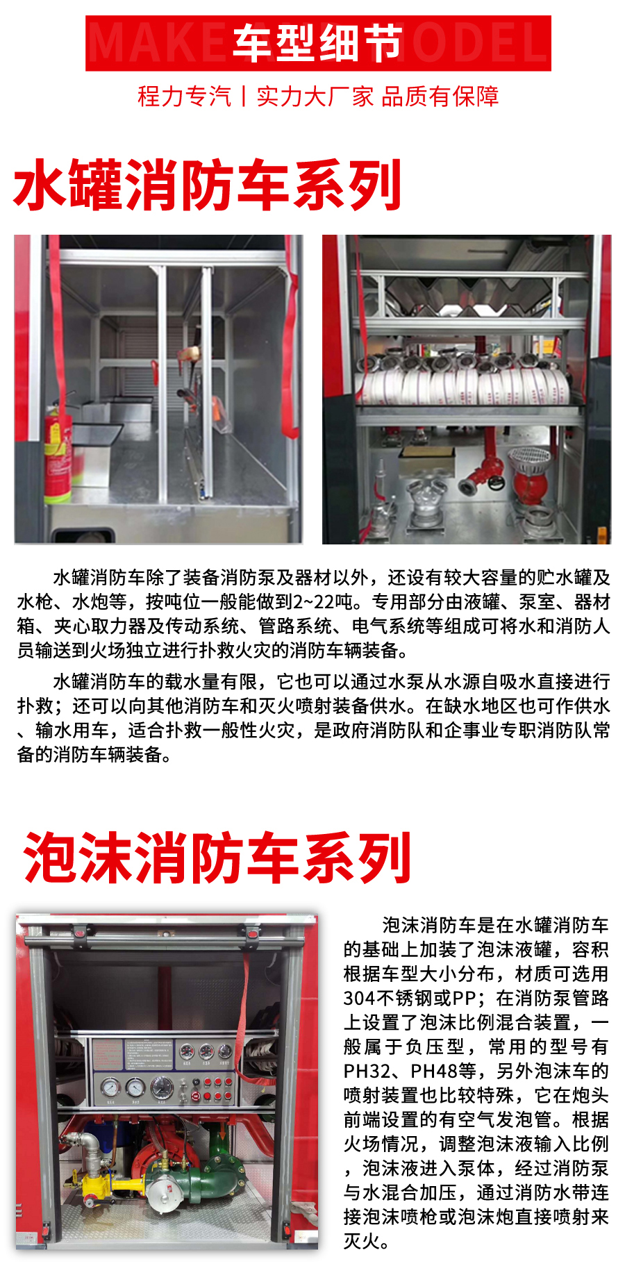 整车由消防员乘员室和车身两大部分组成,乘员室为双排,可乘坐3+3人,该车为外露罐结构,车身前部为器材箱,中部为水罐,后部为泵房。载液罐体为优质碳钢,与底盘采用弹性连接,载水5000kg,装备了上海茸申消防设备有限公司生产CB10/30型低压消防泵,额定流量30L/S,车顶安装成都威斯特消防机械有限公司生产的PS30W型车用消防炮。